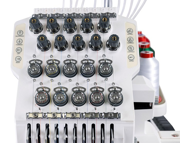 Узкий рукав позволяет производить вышивку не только на крое, но и на цилиндрических изделиях таких, как рукава, карманы, футболки, кепки. Электрическая моталка и пяльцы для кепок входят в комплектацию.